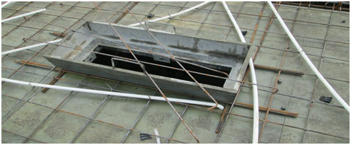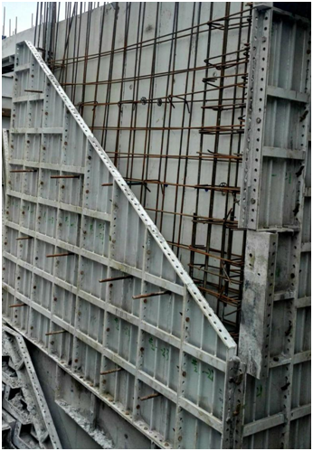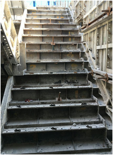 梯間踏步鋁模安裝。該部位砼澆筑時,震動棒斜插入踏步鋁模內(nèi)進行振搗。踏步鋁模上有排氣孔,砼振搗時,便于氣體排除,提高砼質(zhì)量
